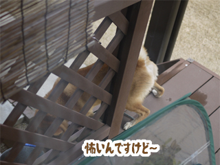 ウッドデッキの階段が降りられないタロー。